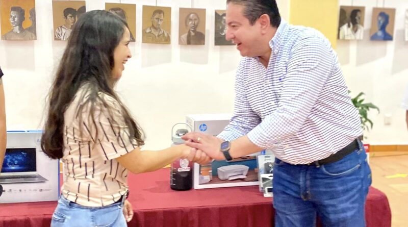 El alcalde, Gustavo Robles Martínez hizo entrega a 120 estudiantes de sus paquetes subsidiados de laptop, impresora, bocina, mp3, usb y termo para el agua.