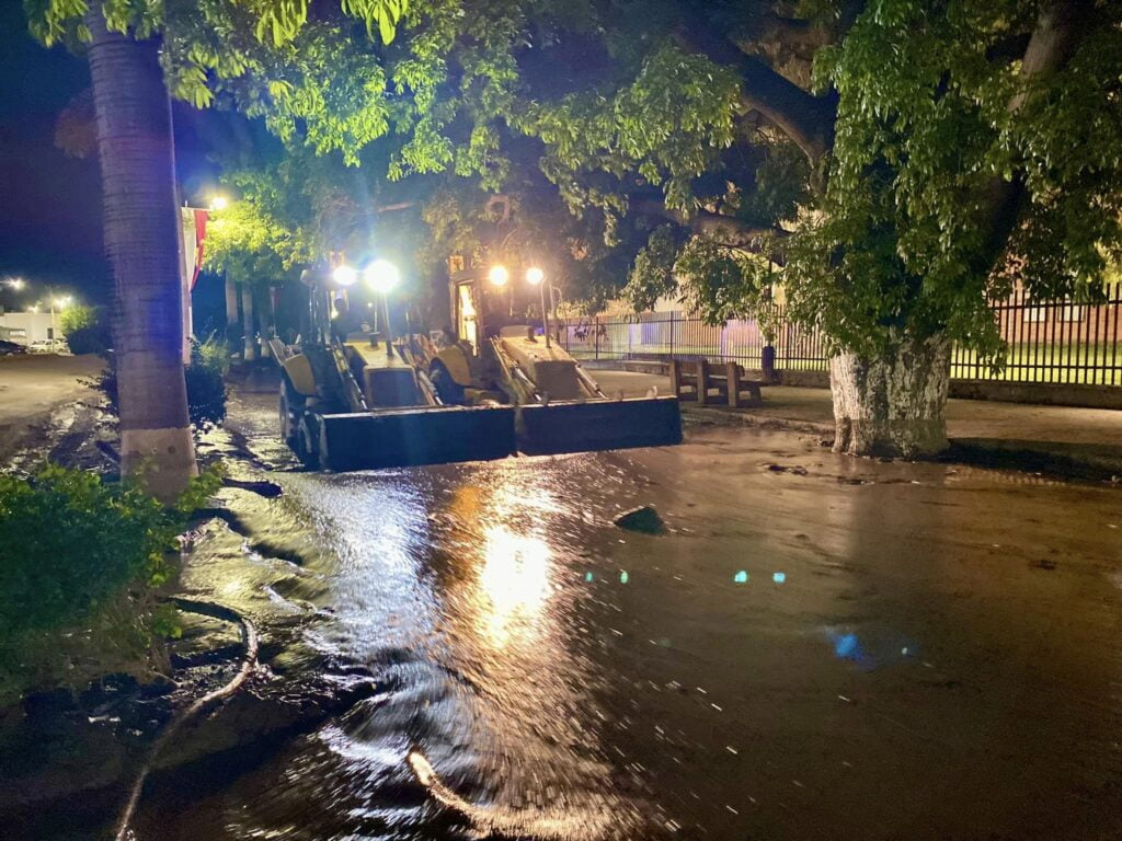 El alcalde, Gustavo Robles Martínez informa que se siguen los trabajos de limpieza, en las zonas inundadas de lodo y desechos forestales, para reestablecer la normalidad de la ciudad, en beneficio de las y los autlenses.”