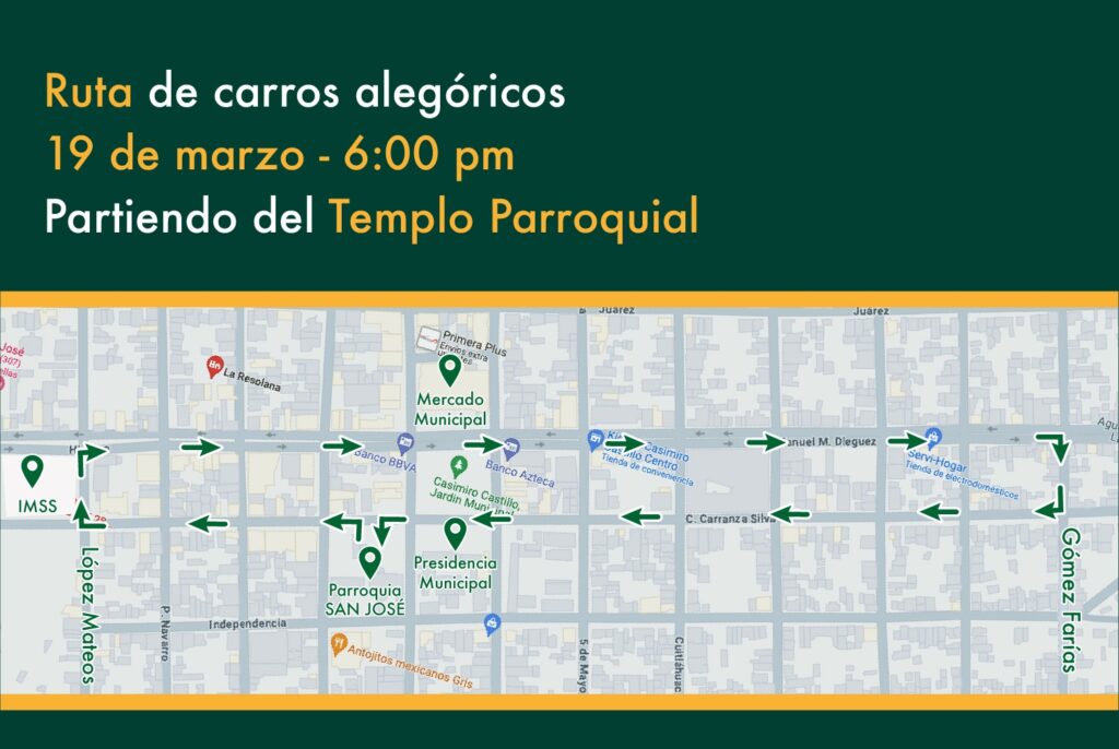 El día el 19 de marzo, como ya es costumbre, a las 6 de la tarde se realizará el tradicional recorrido de carros alegóricos, que partirá del templo parroquial, recorriendo las calles del primer cuadro, para concluir en el mismo punto de partida.