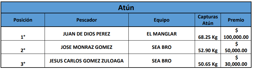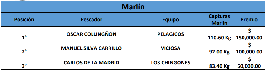 Jaime Hernández, maestro de ceremonia en la premiación, agradeció la participación a los integrantes de los 52 equipos, que durante dos días se hicieron a la mar, en busca de los más grandes peces (marlin, vela, dorado y atún) especies, que, de acuerdo con el Club de Pesca Barra de Navidad, y conforme a la convocatoria, califican en este torneo de Marlin.