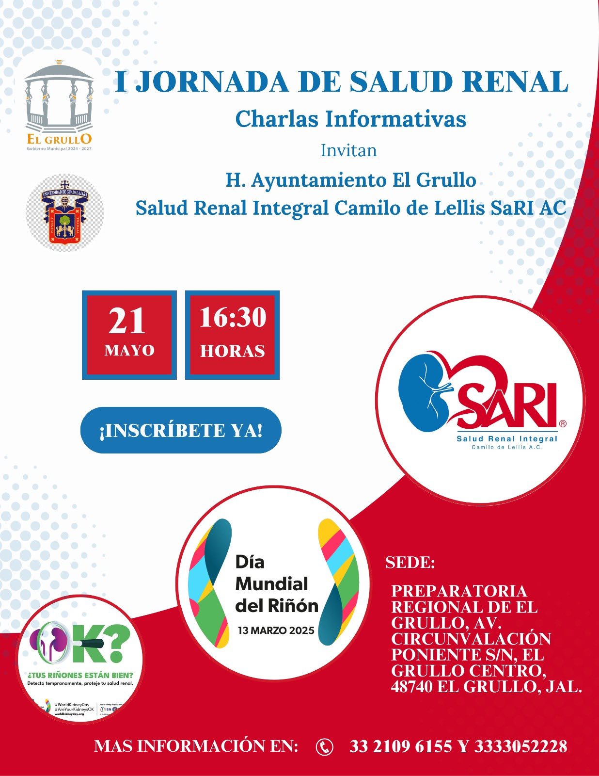 El Gobierno Municipal de El Grullo, que preside el alcalde Milton Cárdenas, en coordinación con Salud Renal Integral Camilo de Lellis SaRI A.C., te invita a participar en la I Jornada de Salud Renal.