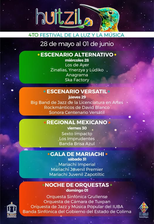 Este es el cartel oficial de del 4 Festival de la Luz y la Música! ¡HUITZIL! Donde podrás asistir con toda tu familia a disfrutar de los escenarios musicales que se han preparado para ti del 28 de mayo al 01 de junio en el Jardín Municipal Ramón Corona en el Centro Histórico de El Grullo, Jalisco.