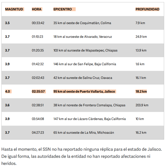El temblor más destacado de la madrugada sucedió cercano a las costas de Puerto Vallarta, Jalisco, con epicentro a 95 kilómetros de la playa y que pudo ser percibido en diversos municipios de la costa sur de Jalisco.